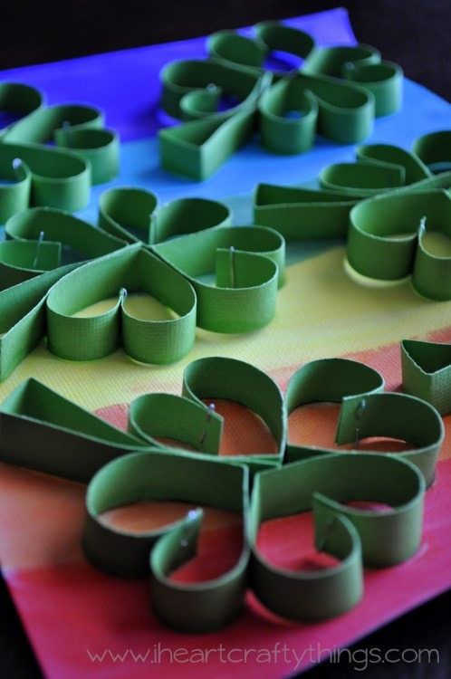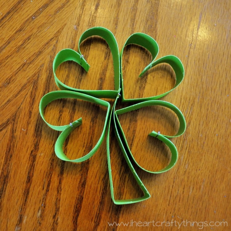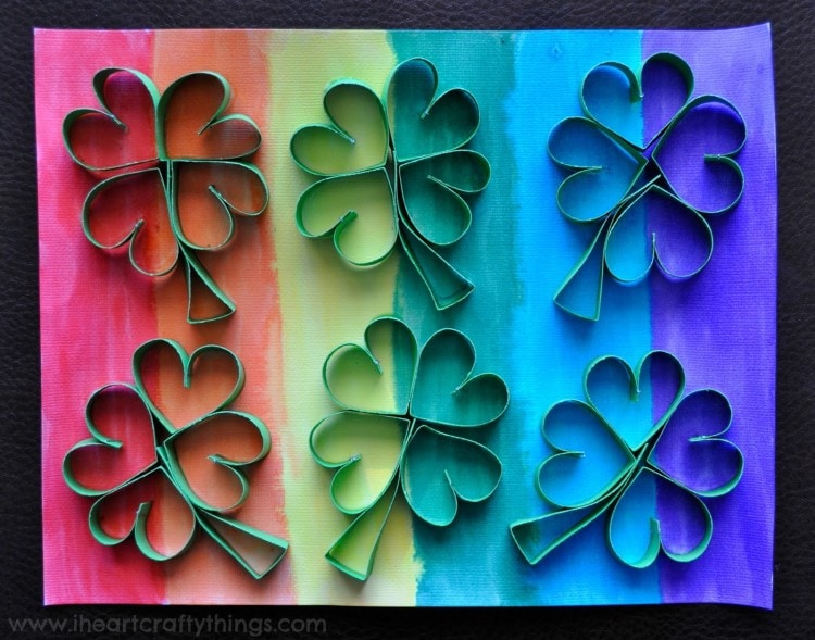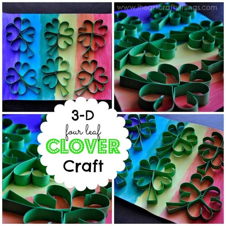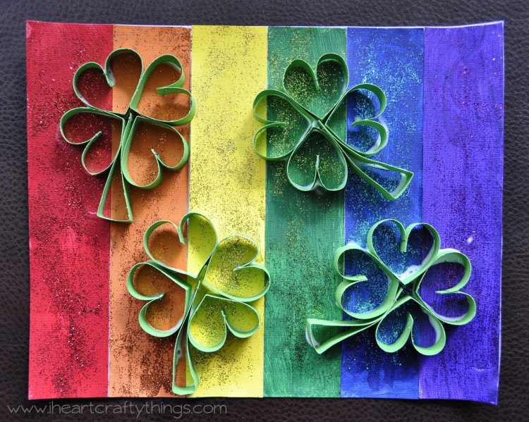 We had a lot of fun with our 3-D Valentine’s Craft so I couldn’t resist trying out something similar for St. Patrick’s Day. Since we have been learning all about rainbows lately and I knew we could make a four leaf clover out of paper hearts, it made for the perfect spring craft!