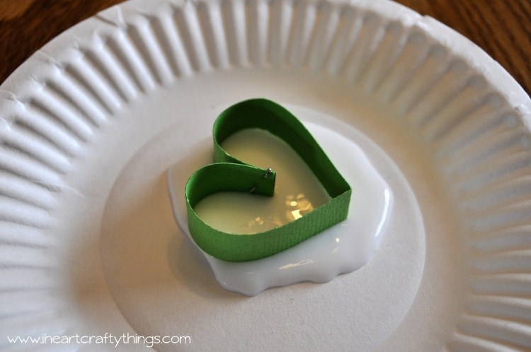 2. While your watercolor painting dries, cut strips of green paper to make your four leaf clovers. I cut my strips 1/2 inch x 5 1/2 inches. If you make 6 four leaf clovers like I did, you will need 30 strips.