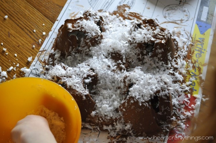 2. While the paint is still wet, I put some fake snow flakes in a bowl and my kids sprinkled it all over the mountains. I waited a couple minutes to let the snow set on the paint and then I dumped any excess off into the trash can.