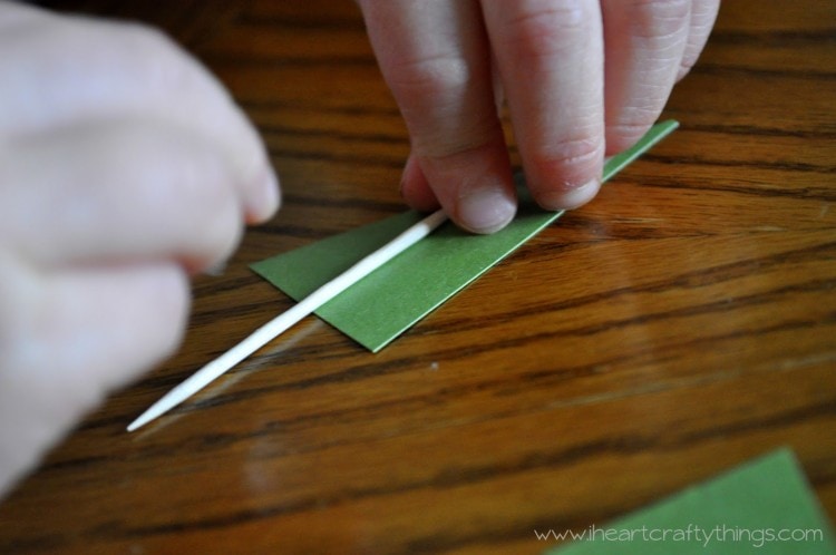3. To make our trees, I cut small triangles out of different colors of green cardstock paper. My kids put a toothpick on the tree and taped it onto the tree. This is awesome fine motor practice. I had to tear the small pieces of tape off for my 3 year old but she was able to line up the toothpicks and put the tape on herself.