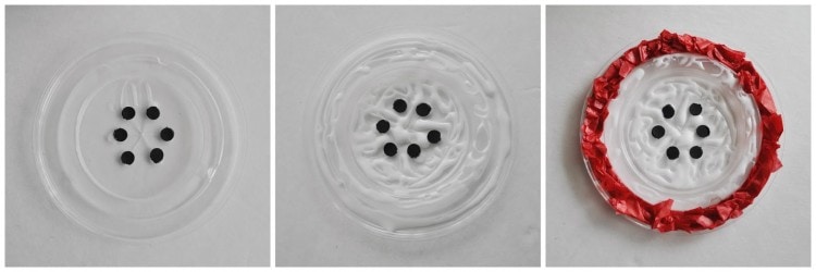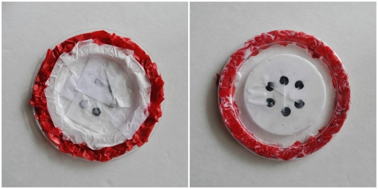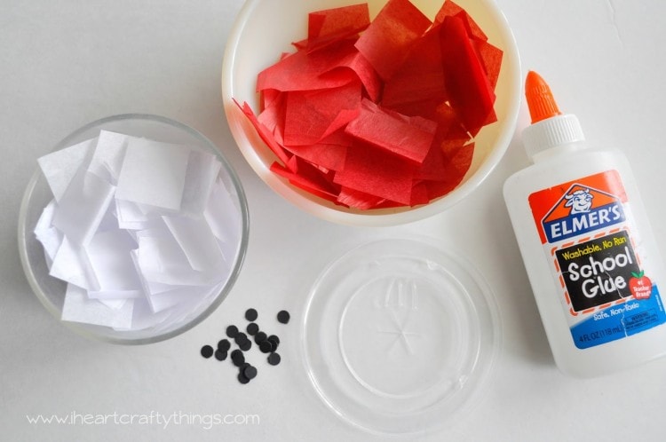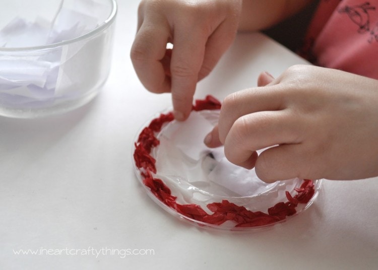 Next add school glue all the way around the outside rim circle of the plastic lid. Crinkle up red tissue paper squares and push them down into the rim of the cup. (I added glue all over my lid when I made mine as you can see pictured in the middle below, but I would recommend doing it in sections to make it easier for kids.)