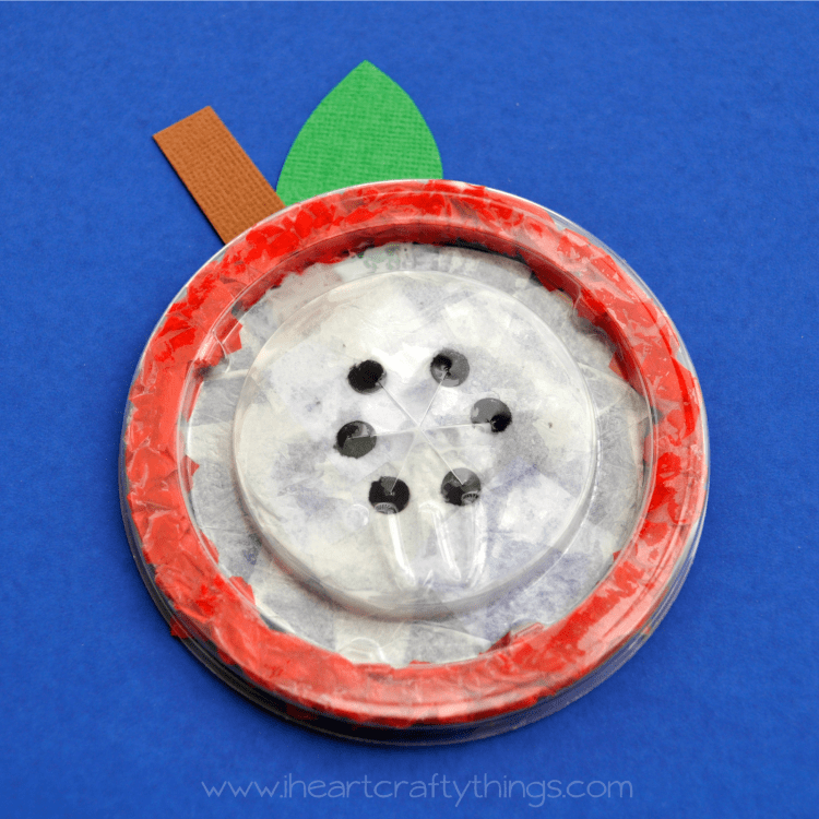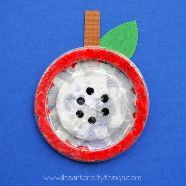 You could also ditch creating the inside view of the apple and just use red tissue paper for the entire apple. Then hang them up on a window to create a stained glass effect with the plastic lid. Lots of fun possibilities!