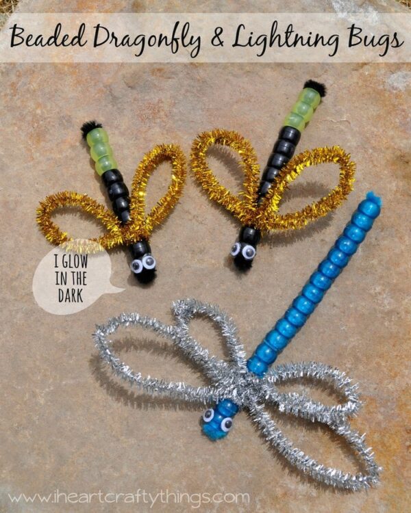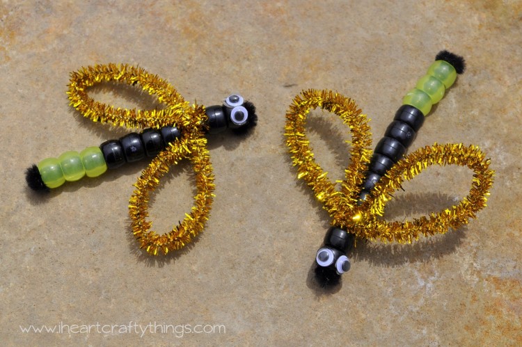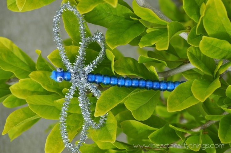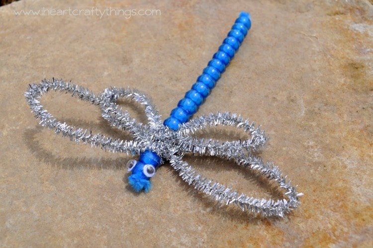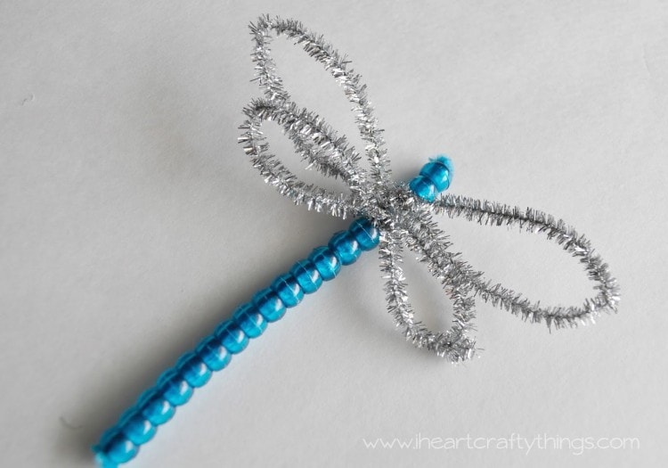 Finish your dragonfly by securing 2 tiny wiggly eyes onto the top pony bead with 2 glue dots. You could use a drop of hot glue if you don’t have glue dots.