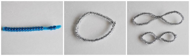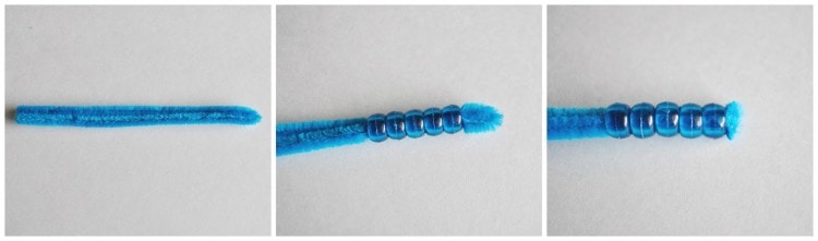 Begin to bead a couple of the blue pony beads onto the fuzzy stick close to the other end of the fuzzy stick. Twist the end a couple times and then fold it over the last bead to hold all the beads in place and to keep them from falling off.
