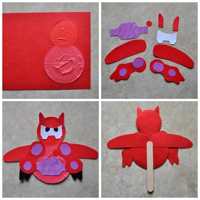 2. Now you’ll need to cut several pieces for your puppet out of your red, purple and white cardstock paper. From red cut out 2 armored arms, 2 wings, the 2 pieces at the top of the helmet and a red circle to cover the heart. From the purple cut out his stomach armor piece and 2 oval pieces for each arm. From the white cardstock paper cut out the Baymax face showing through the helmet.