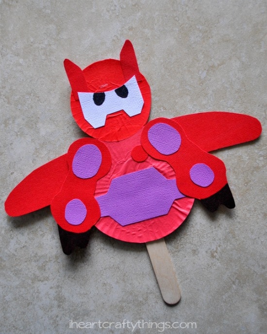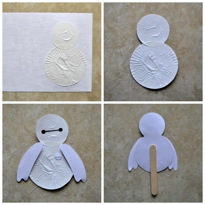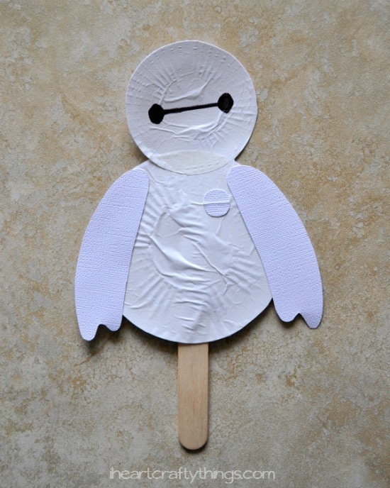 After watching the movie we made stick puppets replicating our favorite character, Baymax. Smaller children will have an easier time making him without his armor on, but older children can easily create him with his armor and wings on and pretend to fly him around in the air.