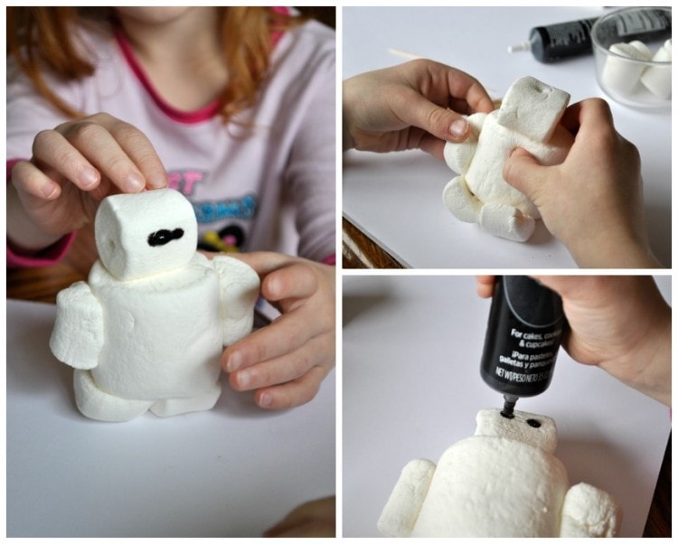My kids had as much fun with this activity as I imagined they would. My 4 year old decided to do some experimenting and discovered that if you lick one side of the marshmallow it easily sticks to another marshmallow, so that is another great way for little ones to easily create their Baymax character.