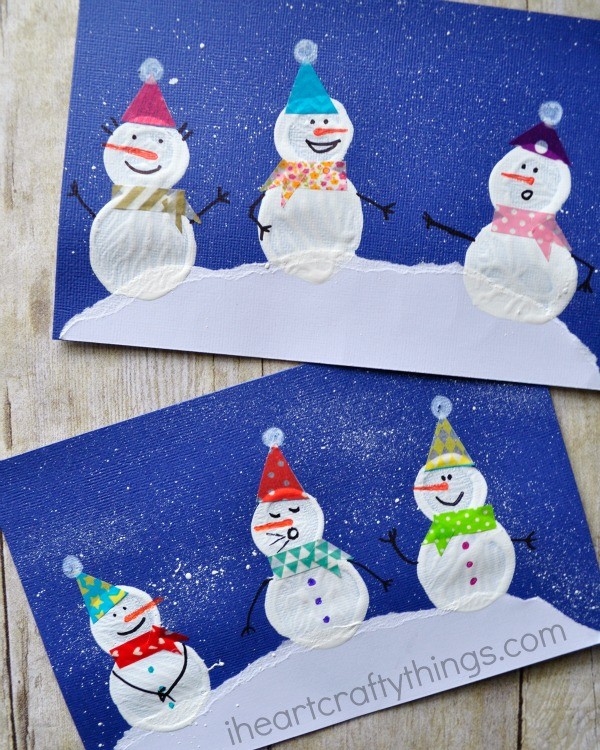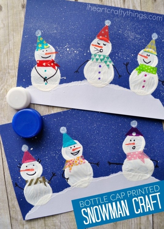 We are currently in the middle of our first winter snow storm.  My kids keep looking out the window at the snow falling and are so anxious for daylight to hit in the morning so they can get out their winter hats and boots and go outside to build a snowman. No matter where you live though and no matter what the weather is like, you can always bring the snowman fun indoors. Start saving those recyclable plastic lids and have an afternoon full of fun making this adorable bottle cap printed snowman craft. Make sure to check out more fun snowman craft ideas near the bottom of this post from the kid craft stars!