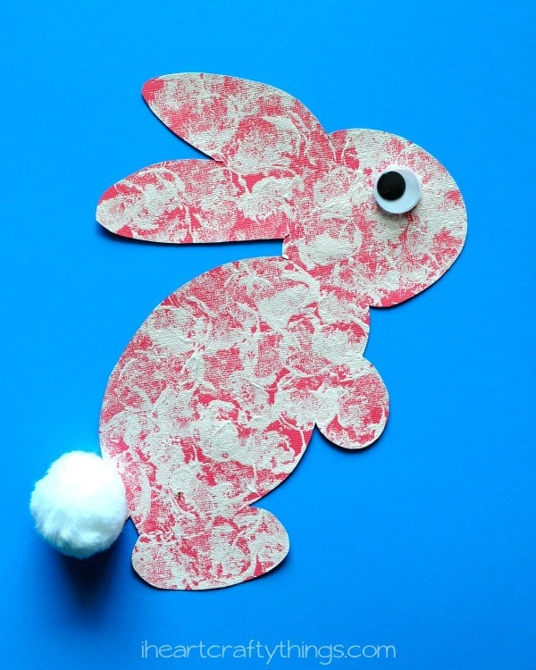 4. Once the paint on your stamped bunny is dry, glue a large googly eye onto his face and a large white pom onto his tail.