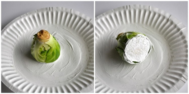 2. Cut the tip off of your Brussels Sprout (adult only). Pour a small amount of white paint onto your small paper plate and rub your Brussels Sprout around in it coating the bottom of it completely. (Note: Try not to over-saturate the Brussels Sprout, you only need a small amount on it to get the fun texture.)