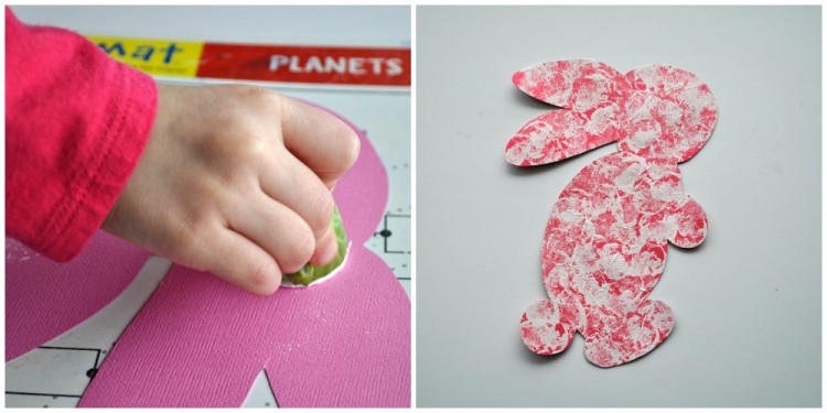 3. Press your Brussels Sprout onto your bunny, and continue stamping it until the bunny is covered. Add more paint to your plate during stamping as needed.