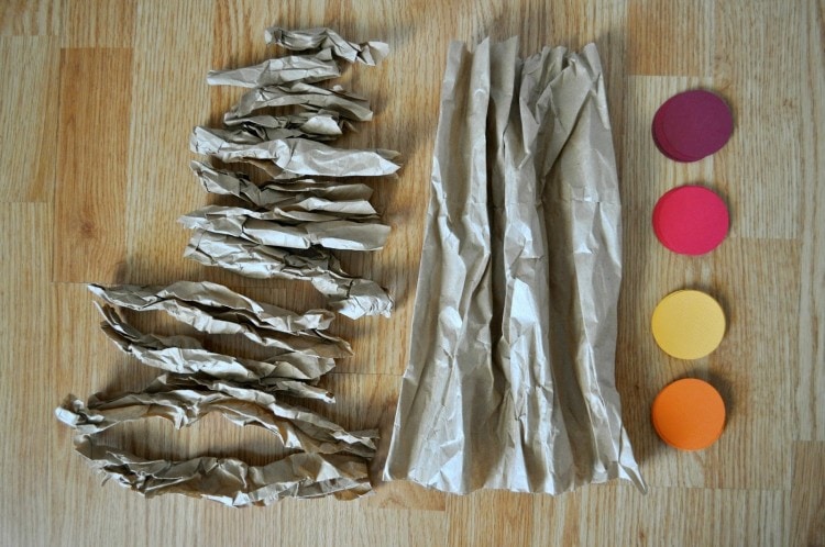 2. Get all of your tree pieces ready. First I cut pieces for our tree. We used some brown packaging paper that we had from a package that was mailed to us, but brown lunch sacks or brown tissue paper would work just as well (if not better). I cut a large piece for a trunk and several small strips in varying lengths for the branches. Crinkle all of them to give them more of a realistic look.
