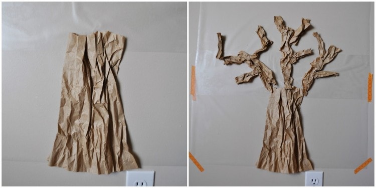 Note: We had a couple of our branches that had a little trouble staying on our tree. It might have been the weight of the packaging paper we used. We were able to just stick them back on and press them firmly on the contact paper, but the more lightweight material you use the better on these sticky walls. Lunch sacks and tissue paper would be a great tree base material.