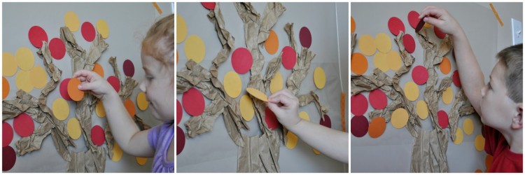 4. Add all of the leaves onto your tree branches to finish your tree. We of course had some falling off the tree and on the ground.