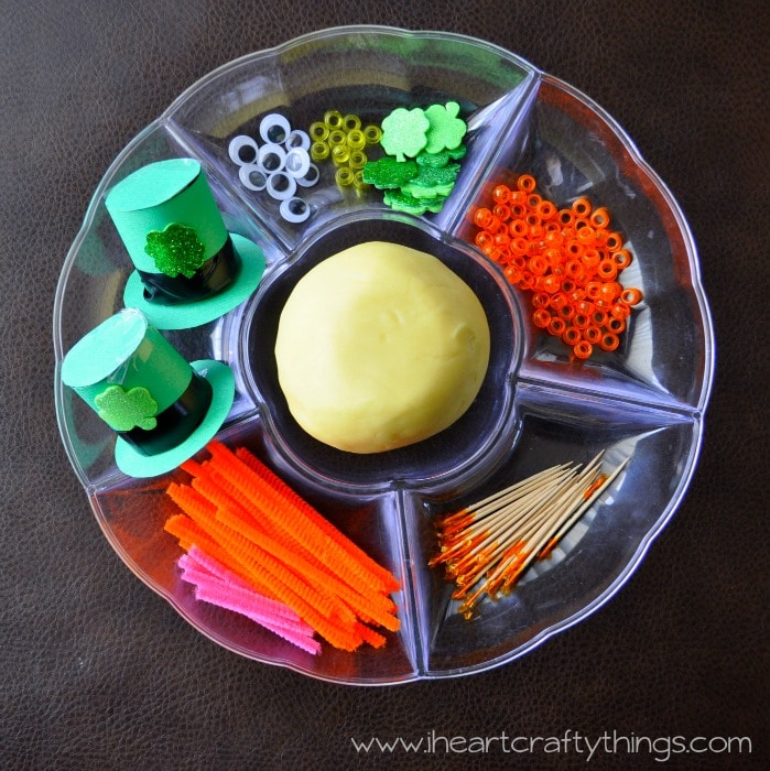 Included in our tray with our play dough I used googly eyes, orange cocktail toothpicks, small shamrock stickers and the Leprechaun hats that I made out of empty toilet paper rolls. I will tell you how I made those in a minute.