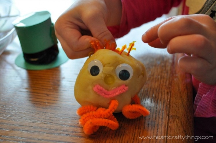 To make the orange Neon Fuzzy Sticks curly we wrapped them around our finger. They made such a perfect Leprechaun beard! I wanted to mention that our cocktail toothpicks ended up being too long to poke through our play dough so once I discovered that I trimmed all of them so they would work. So if you want to use those, make sure to give them a trim before you start playing.