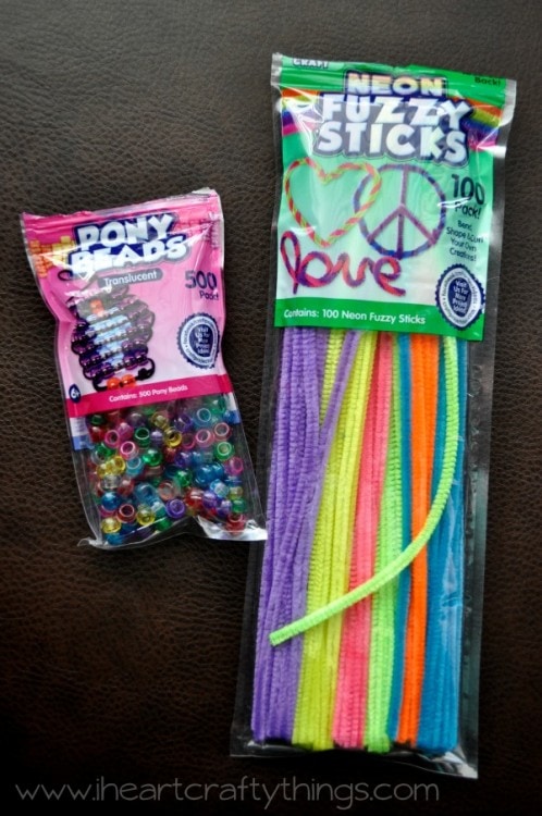 We were also able to use and try out some products we recently received from our friends at Craftprojectideas.com. We cut up several orange Neon Fuzzy Sticks in thirds and one pink Neon Fuzzy Stick in small sections for a mouth. We also used some orange and yellow Pony Beads. (We received these products for free from Craftprojectideas.com but any and all opinions expressed are 100% our own.)