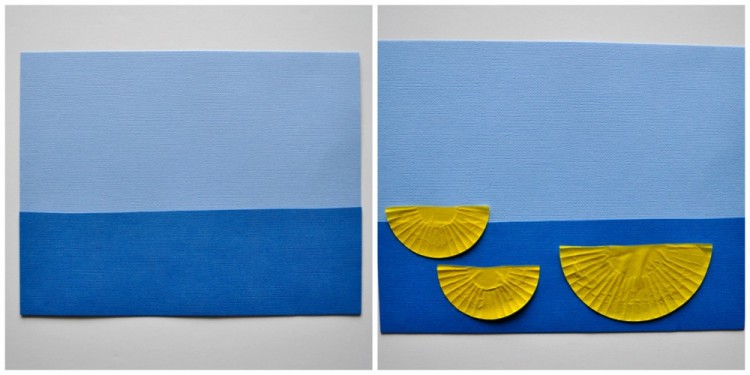 Start by cutting a strip of your dark blue cardstock paper for the water and gluing it along the bottom of your light blue cardstock paper.