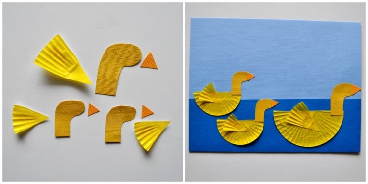 Cut out the rest of the pieces for your ducks. You’ll need a head and beak for each, and a small section of your remaining cupcake liners cut off into a triangle for each duck for the wings.