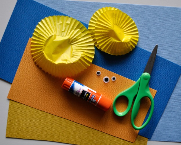 Cut your regular sized yellow cupcake liner in half and 1 of your mini yellow cupcake liners in half. Glue one half of your regular size yellow cupcake liner onto your paper and both of halves of your mini yellow cupcake liner.