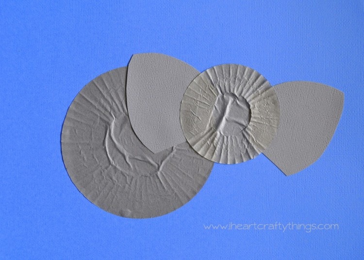 Now its time to glue your large gray cupcake liner onto your blue cardstock paper, then glue your head with ears attached onto your blue cardstock paper.