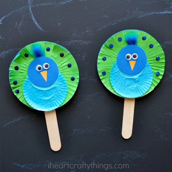 Finish your peacock by gluing it onto a jumbo craft stick with tacky glue. Let it dry for about an hour before playing with it.