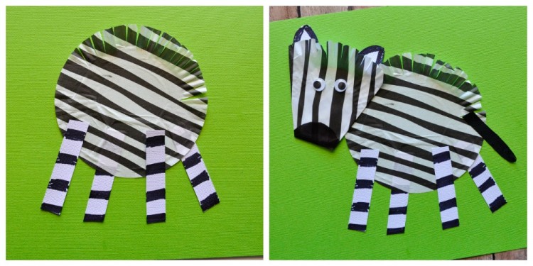 Finish your zebra by gluing on a black tail (cut from your black cardstock paper) and some googly eyes.