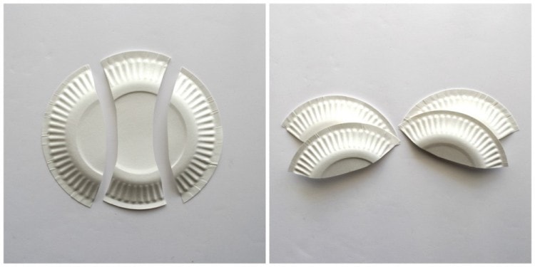To make your dragonfly wings, cut two leaf shapes out of each paper plate. Glue two of the leaf shapes together with your tacky glue, overlapping them some to make two wings. Do the same with the other two leaf shapes.