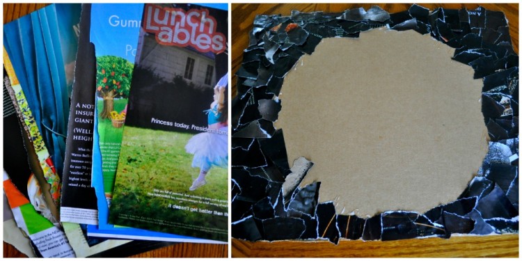 4. To start our collage, trace your circle Earth onto your cardboard background then remove it. Tear little pieces of the black colored magazine pages and glued them around our cardboard backing, leaving the circle empty in the middle to put your Earth on.