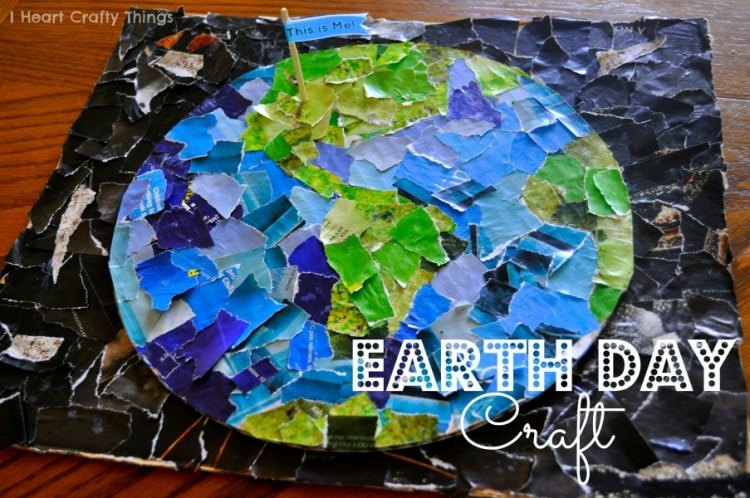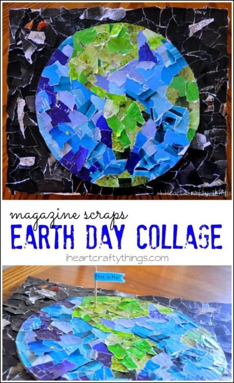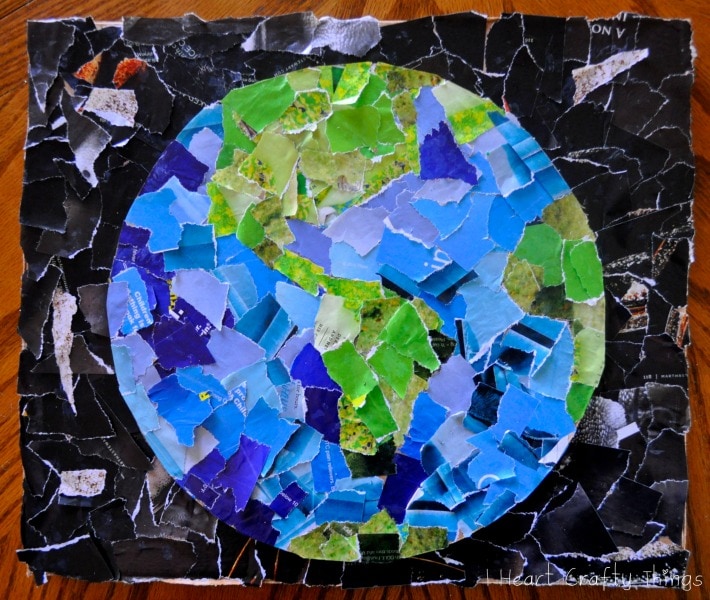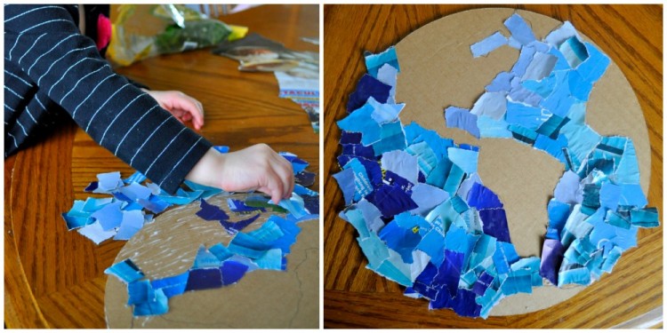5. Next get started on your Earth. I knew getting the blue pieces to line up around the countries would be difficult so I helped my kids with this part and just let them know it didn’t need to be perfect. After outlining the countries with the blue torn magazine pages, we added glue in the rest of the water areas and finished putting the water pieces in place. You can see below that my toddler was a big helper.