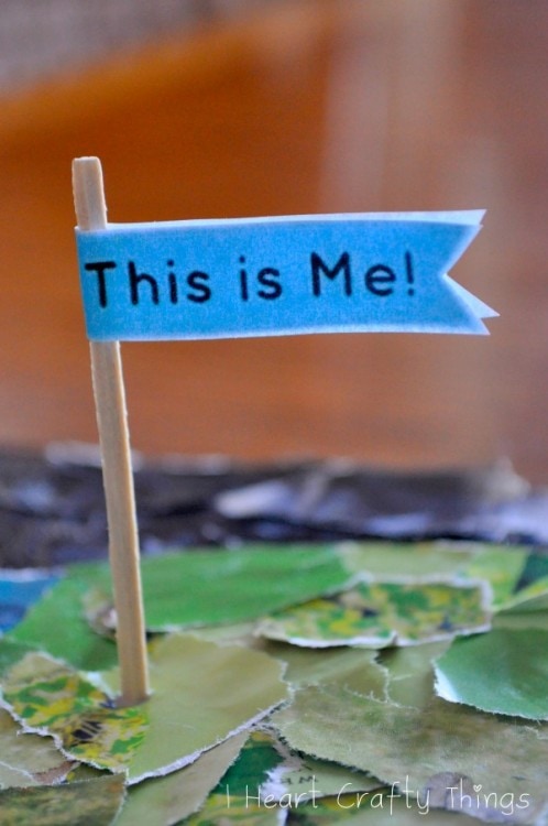 One thing we talked about this year was how big our Earth is and how small our town is when we compare it to the size of the Earth on a map or globe. To go along with this theme and with a book we checked out at the library (I’ll show you in a minute), I made this little flag for us to put at our location on the Earth.