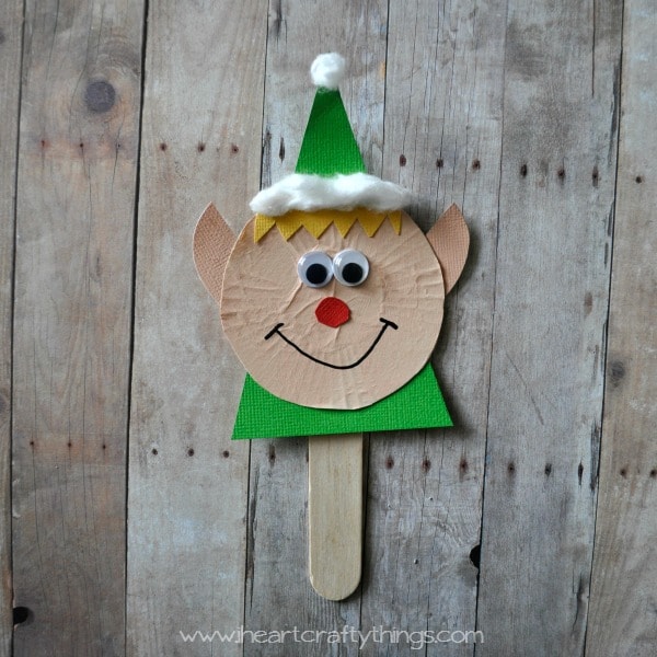 6. Finish your puppet by putting a generous amount of tacky glue half way down the jumbo craft stick and attaching it to the back of your elf.