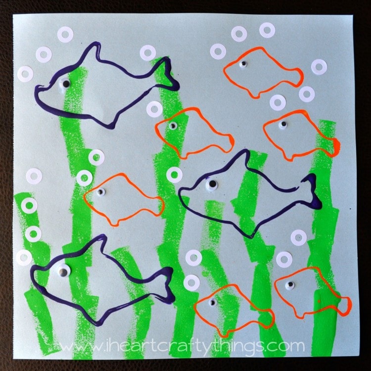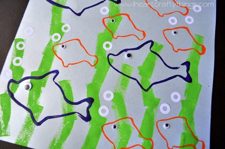 3. Once the paint is completely dry, use the hole reinforcer stickers to make bubbles around the fish. Also glue a googly eye in each fish. (My daughter always insists on gluing two googly eyes on each fish.)