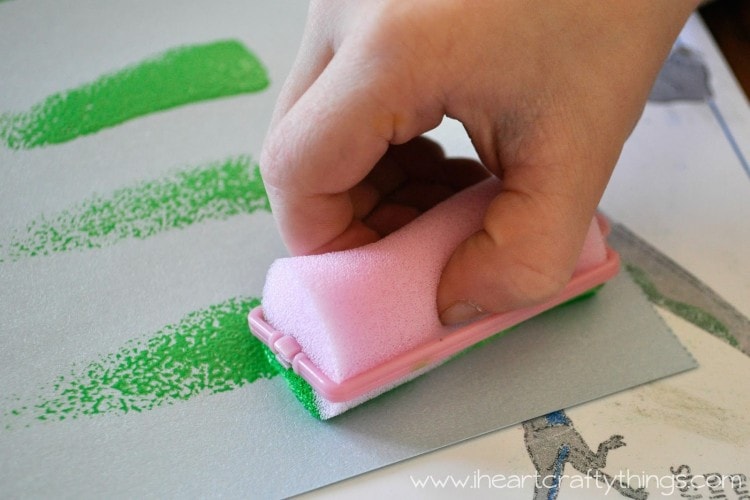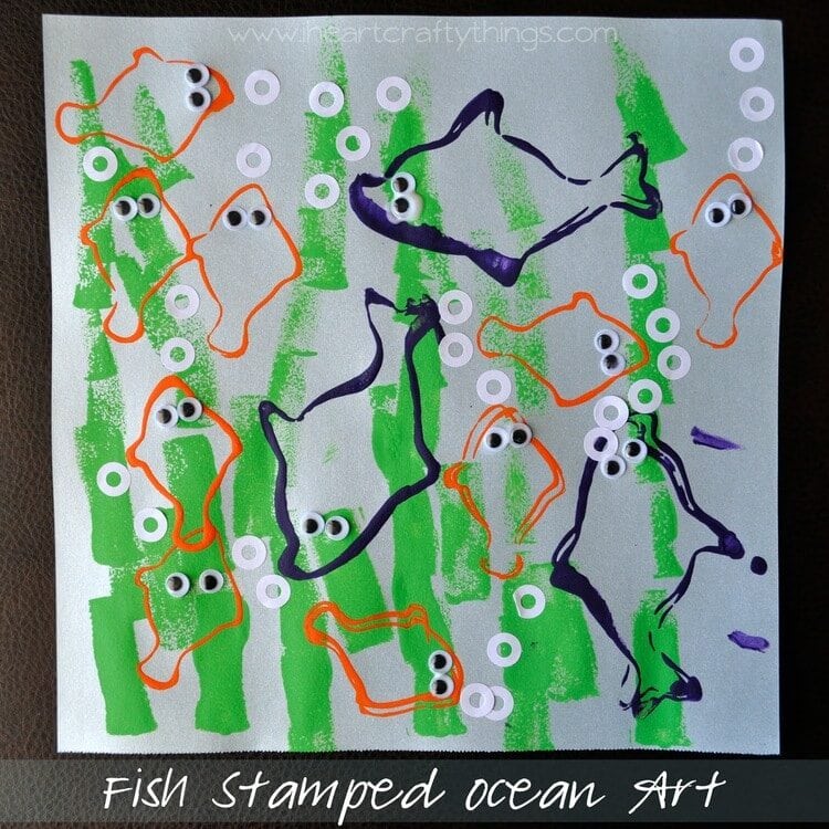 When you are finished you have a beautifully stamped ocean fish scene. If you want to add additional details to the fish, you could always use glitter glue inside the fish or glue sequins inside the fish. You could also use crayons to color the inside of the fish. We liked the simplicity of leaving the fish stamped.