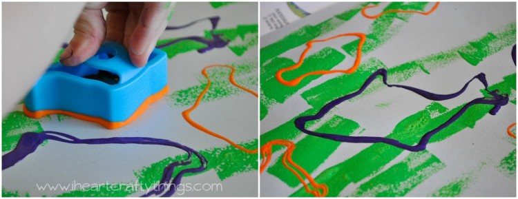 2. Pour some purple and orange paint on small paper plates. Dip your cookie cutters into the paint and stamp them onto your paper to make your fish in your ocean scene. Let the paint dry completely.