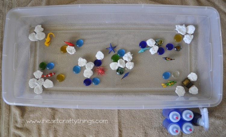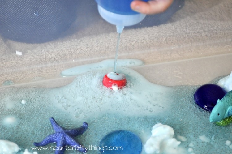 When I originally saw Fun at Home with Kids’ Fizzy Small World Ocean Activity I fell in love with it! You can clearly see I got my entire idea for this activity from them so in an effort to give them full credit I want you to go over to their site to see exactly how to make your fizzy dough and how they set up their ocean bin.