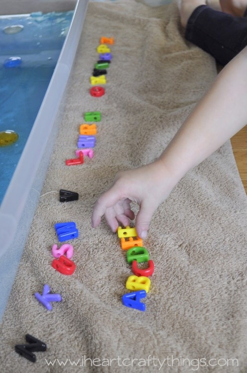 While my daughter played I lined all the letters up in random order along the towel to dry. Before we cleaned up I had her line them up in correct order from A to Z, naming them as she put them in order. I was there to help her if she needed any assistance or got stuck along the way.