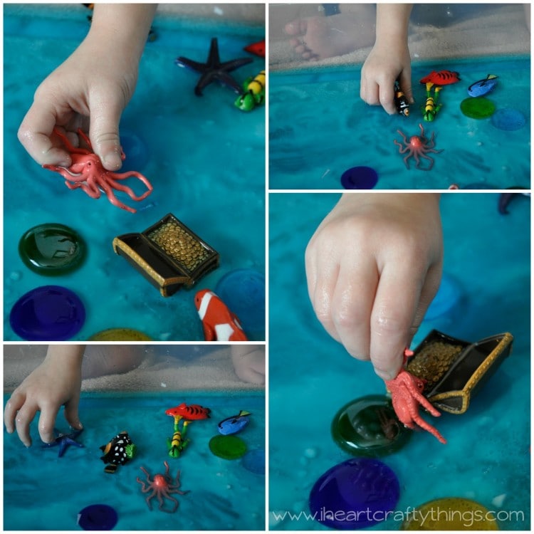 After she found all the letters she enjoyed small world play with all the little creatures. The octopus was her favorite. In her deep octopus voice she kept telling all the other fish to “Stay away from my treasure!” It was a hoot for me to watch!