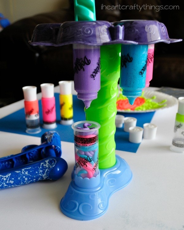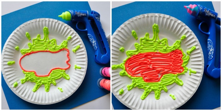We purchased some extra colors with our kit and I’m so glad we did because it has made it even more fun for my kids. My daughter helped me mix together this swirl of pink, blue and purple and I used it to outline the frame of my paper plate, making my artwork even more colorful.