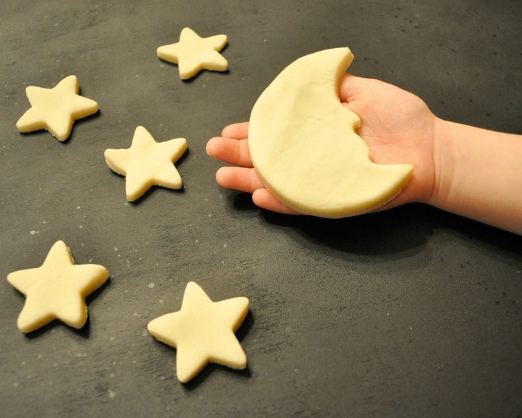 Welcome to another edition of the 12 Months of Sensory Dough. This month is all about Glowing Dough. This past week as I’ve dropped my boys off at school we’ve been able to see the moon off in the distance in the sky in front of us. The other day it was so big and seemed so close and my daughter leaned over to one of my son’s and said, “I’m going to ask Mommy to get a big, big ladder and climb up and get the Moon for me.” True story! It was pretty adorable! As I thought about our Glowing Dough challenge and our recent excitement over seeing the moon in the sky each morning, I decided to make Glow in the Dark Play Dough and combine it with moon and star cookie cutters to make our own pretend night sky.