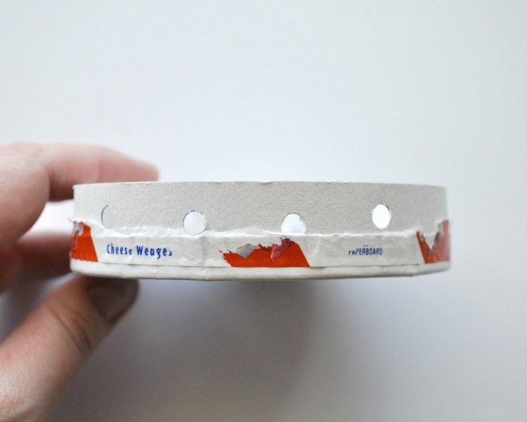 1. Start by taking the lid off your cheese container. Use your hole punch to punch four holes on each side of the container, trying to line up the holes on each side the best you can. My container already had a hole on each side, so I only had to punch 3 holes on each side.