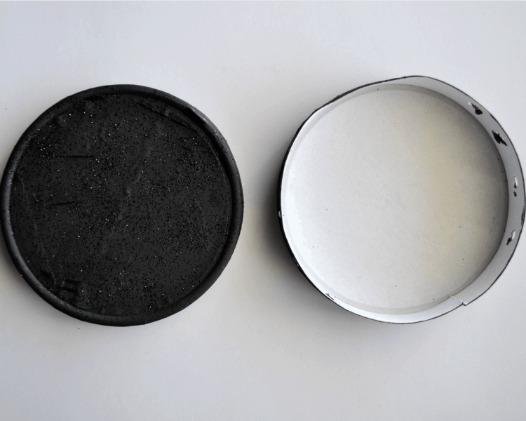 2. Paint the lid off of the cheese container. While the paint is still dry, sprinkle black glitter all over the top of the lid. Also, paint the entire outside of the cheese container. Let it dry completely. If you plan on hanging your spider you’ll need to paint the bottom of the cheese container too.