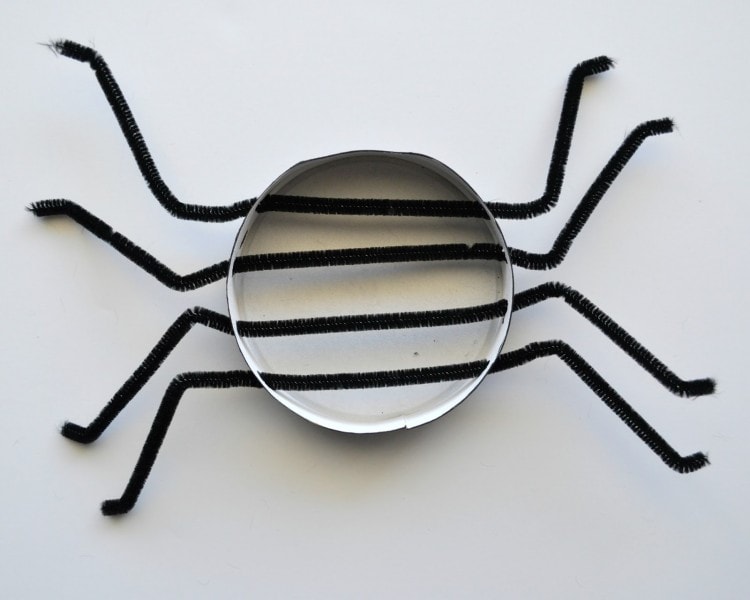 3. When your paint is dry, thread your four pipe cleaners through the holes in your cheese container, lining up the holes on each side. Bend the pipe cleaners to make spider legs.