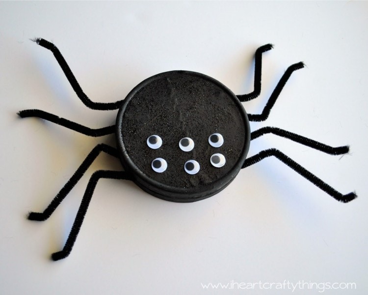 5. Once you have put the legs in your spider, you can put the lid back on your cheese container. Ours stayed securely on, but if you want to add some glue to the inside edge to keep it firmly in place you can.