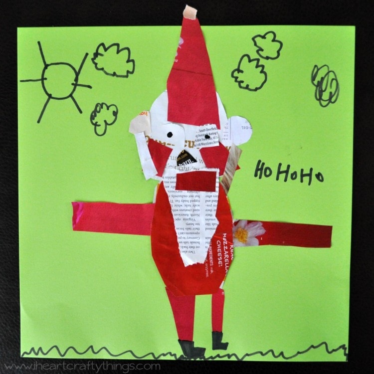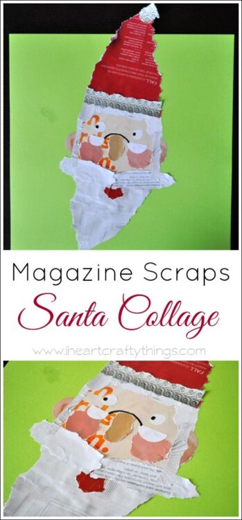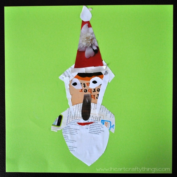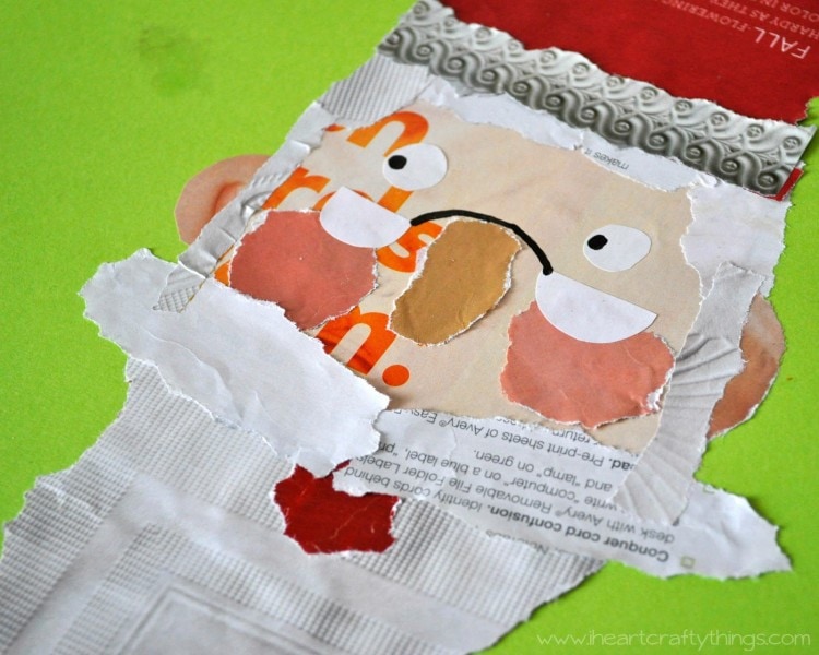 Simply cut or tear out different pieces from an old magazine to create a Santa. You can see a close up of how I layered my pieces together below to create my Santa. Get creative…Make rosy cheeks, glasses, anything that will give your Santa character. I tore all my pieces from the magazine pages but my boys felt it was easier to use scissors to cut all their pieces.