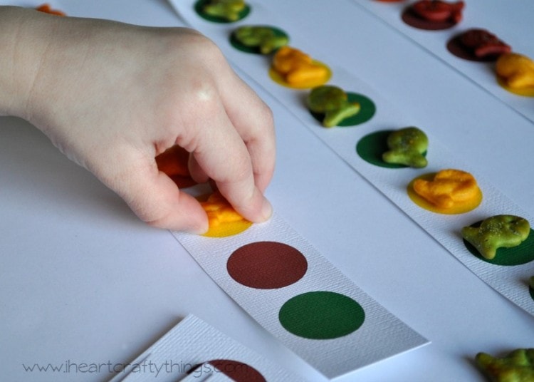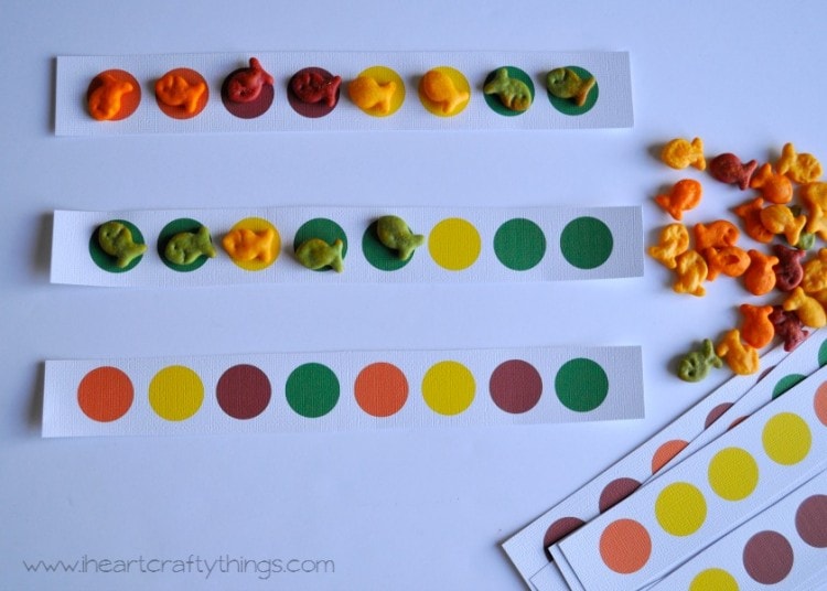 Colors Goldfish crackers also make for perfect pattern practice. I whipped up these pattern printables and after printing them out, all you have to do is cut them into individual strips and lay them out with some Goldfish crackers.