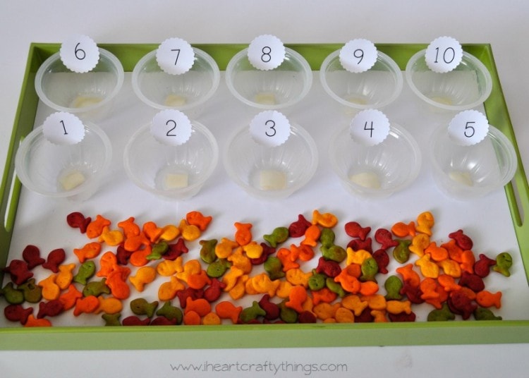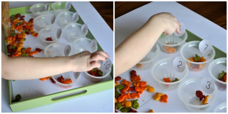 When your counting tray is all ready, your preschooler is all set to practice her counting. This activity helps with number recognition, counting out loud and it is great for fine motor development with moving all those Goldfish crackers into containers.
