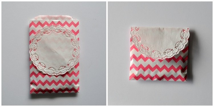 2. Lay your doily at the top of your treat bag and then fold down the bag and doily to the back to form a square.
