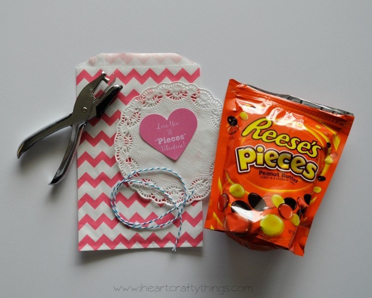 3. Cut a heart out of your pink cardstock paper with your heart punch, and then write Love You to “Pieces” Valentine! on it. I actually had planned on having a printable for you for this, but after I made them today I was having trouble with my computer and the printable didn’t save like I thought it had. 🙁