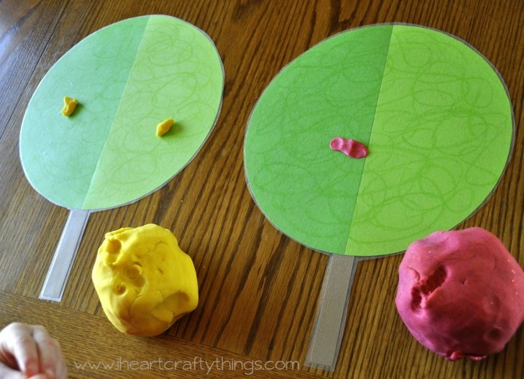 Before we started the activity I made two lemon trees that are reminiscent of the trees in the book. I taped two different shades of green cardstock together, traced a big circle bowl onto the two papers and then cut it out. I also drew squiggly lines all over the trees with a green crayon, just like the trees in the book. After taping a tree trunk on the back of the tree, I laminated them with contact paper so we could use them with the playdough.